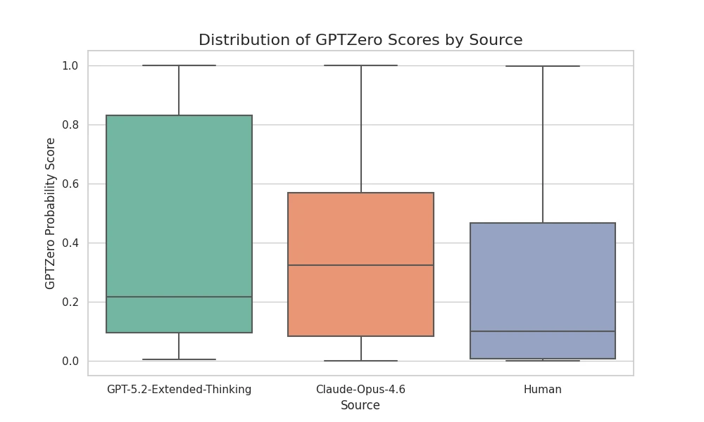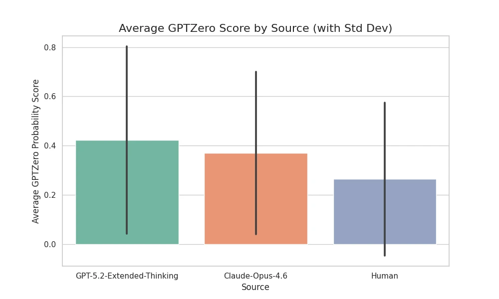 This means that more than half the time, GPTZero looked at code written by GPT-5.2 or Claude and confidently labeled it as "Human."