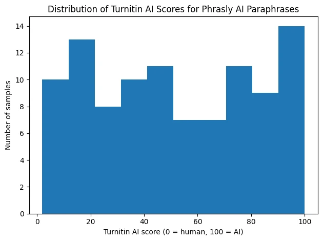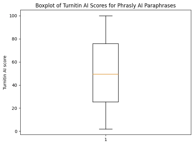 This big spread tells us that Turnitin isn’t certain that all Phrasly outputs are AI, but on average it sits around 50. That’s basically an “I’m not sure if it’s AI or not” kind of score. Still, you will occasionally see very low (2) or very high (100) detections.