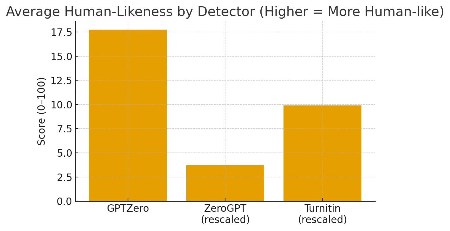To make sense of all this, they converted everything into a common scale called “human-likeness.” For ZeroGPT or Turnitin, they took 100 minus the AI score; GPTZero already provided a direct 0–100 human-likeness scale.