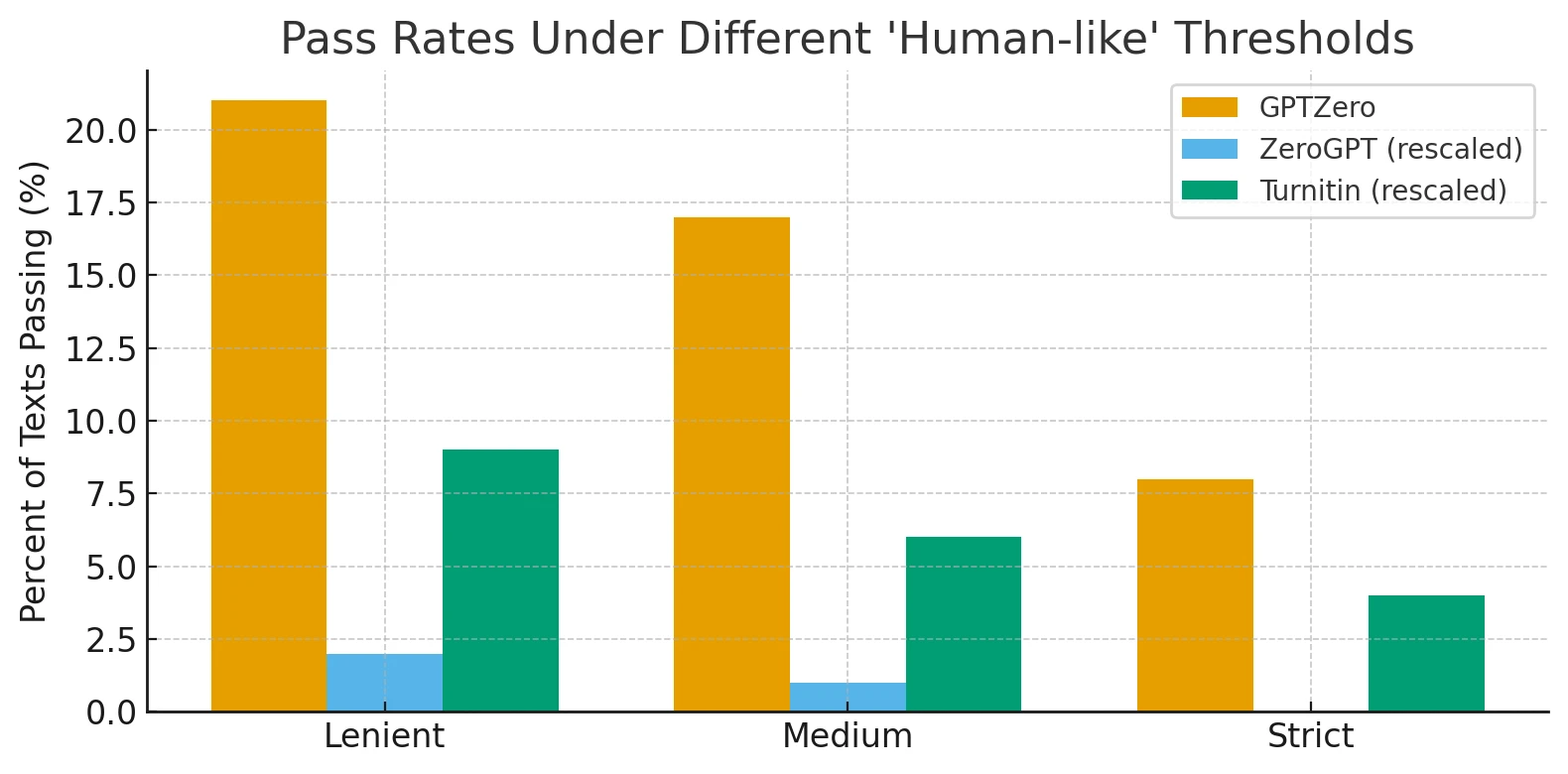 Even on the most forgiving detector (GPTZero), only 8% pass the strict bar (≥ 90). That’s extremely low.