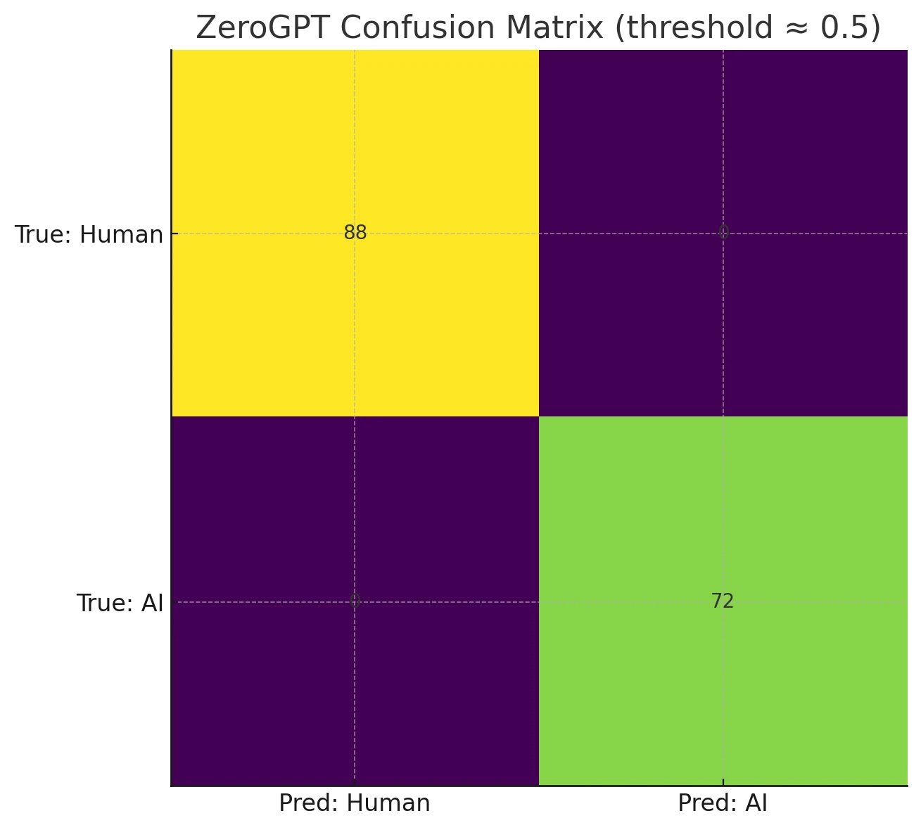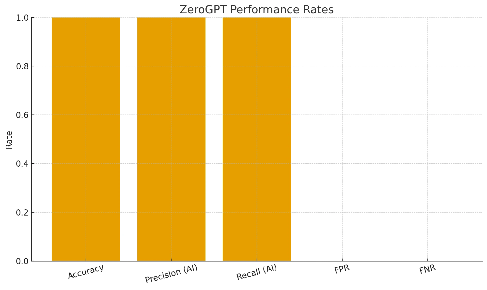 The simple answer is that it seems to use a very conservative approach for detecting AI. In a dataset of 160 pieces of text, ZeroGPT did not flag any single human text as AI. Hence, it had 0 false positives (meaning no human content was mislabeled as AI) on that sample. If your main concern is that you don’t want your hand-written stuff to be flagged incorrectly, then ZeroGPT’s got you covered—at least for those samples tested.