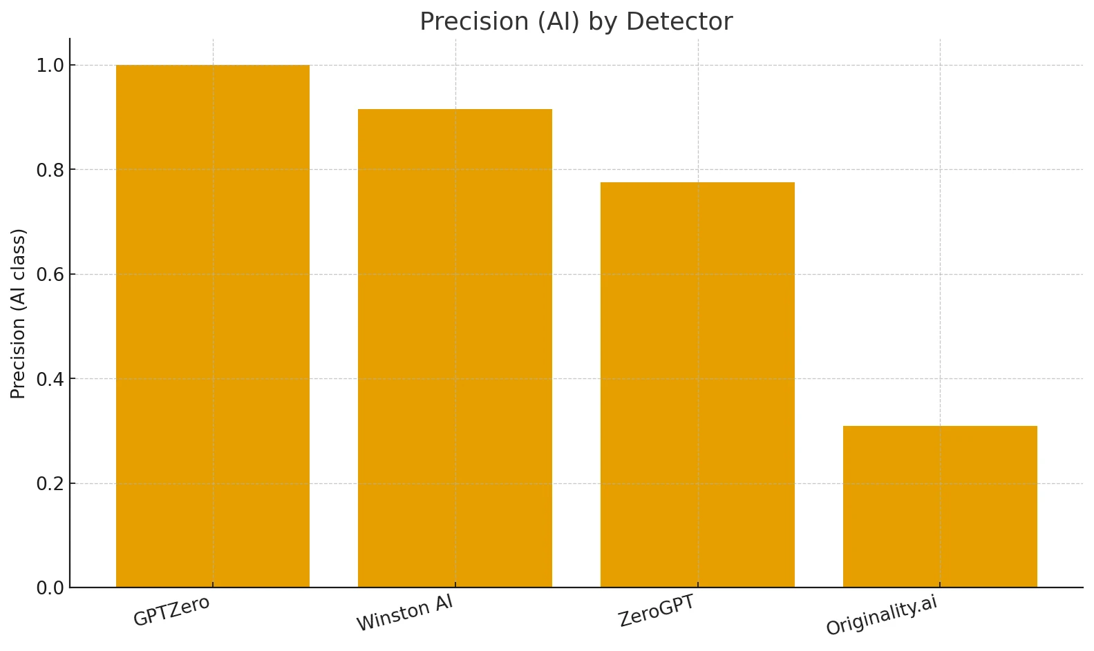 - Its precision was lower, meaning it flagged more human texts as AI and might cause false alarms.