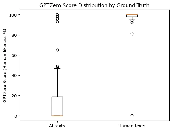 - GPTZero score goes from 0–100%. Higher means more human-like, so 100% is definitely considered human by GPTZero.
