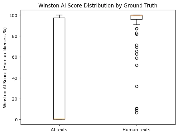 Winston AI, on the other hand, shows a much wider overlap. AI texts sometimes get high human-like scores, which makes Winston AI more prone to mislabeling. That’s the main reason Winston AI’s overall accuracy isn’t as high.