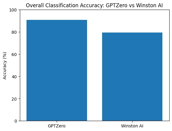 GPTZero has much more famous than GPTZero and it shows why. Winston AI’s detection capabilities also seem limited compared to GPTZero. We tested 160 texts in total—82 were AI-written, and 78 were human-written. GPTZero’s overall accuracy stood at 90.63%, while Winston AI’s came in at 79.38%. You can see this vividly on the bar chart where GPTZero’s bar (~90.6%) towers over Winston AI’s bar (~79.4%).