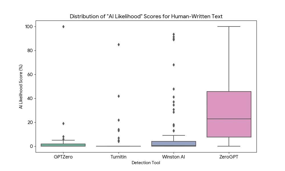 We also looked at the "AI Likelihood" scores these tools gave to human-written text. GPTZero and Turnitin typically give human text a score near 0%, whereas ZeroGPT's scores are often pushed deep into "AI" territory.