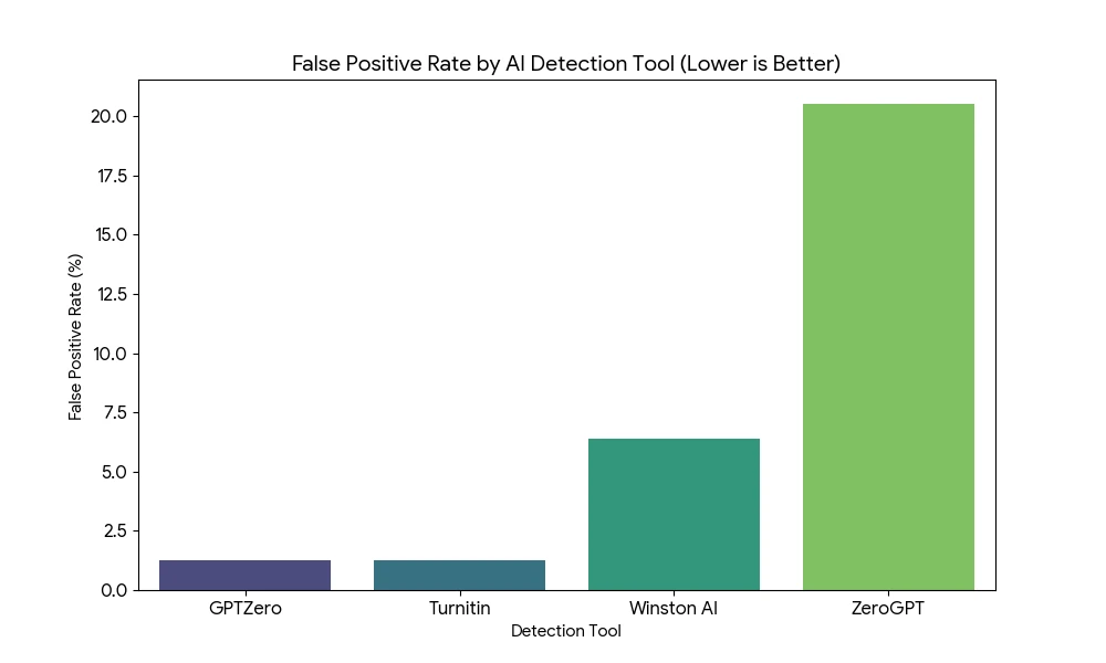 Both GPTZero and Turnitin tied for the lowest False Positive Rate at a very respectable 1.28%. This means they are the most reliable tools when it comes to protecting honest students from false accusations. GPTZero also took the crown for the highest overall accuracy, making it the most balanced tool in our testing suite.