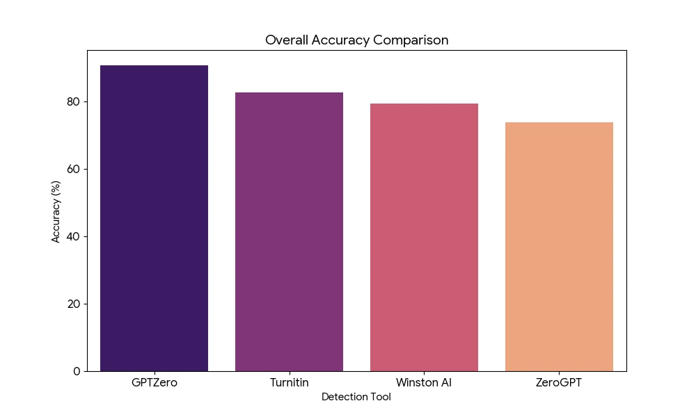 The bar chart below illustrates the gap between the tools. While GPTZero and Turnitin remain near the bottom (where you want them to be), ZeroGPT spikes dangerously high. - Overall Accuracy